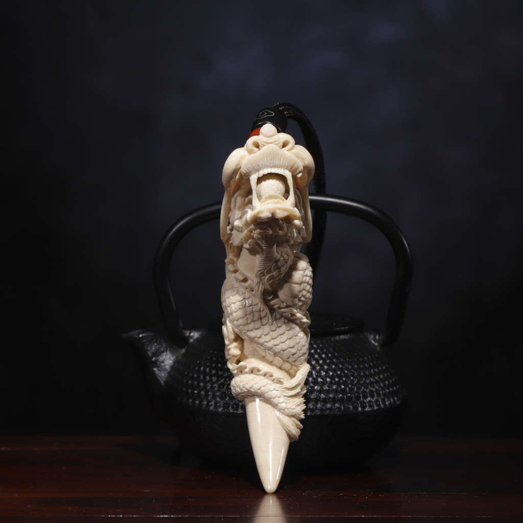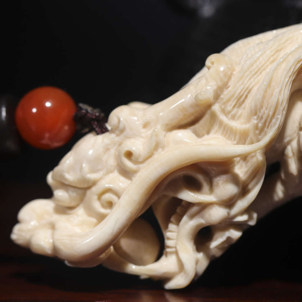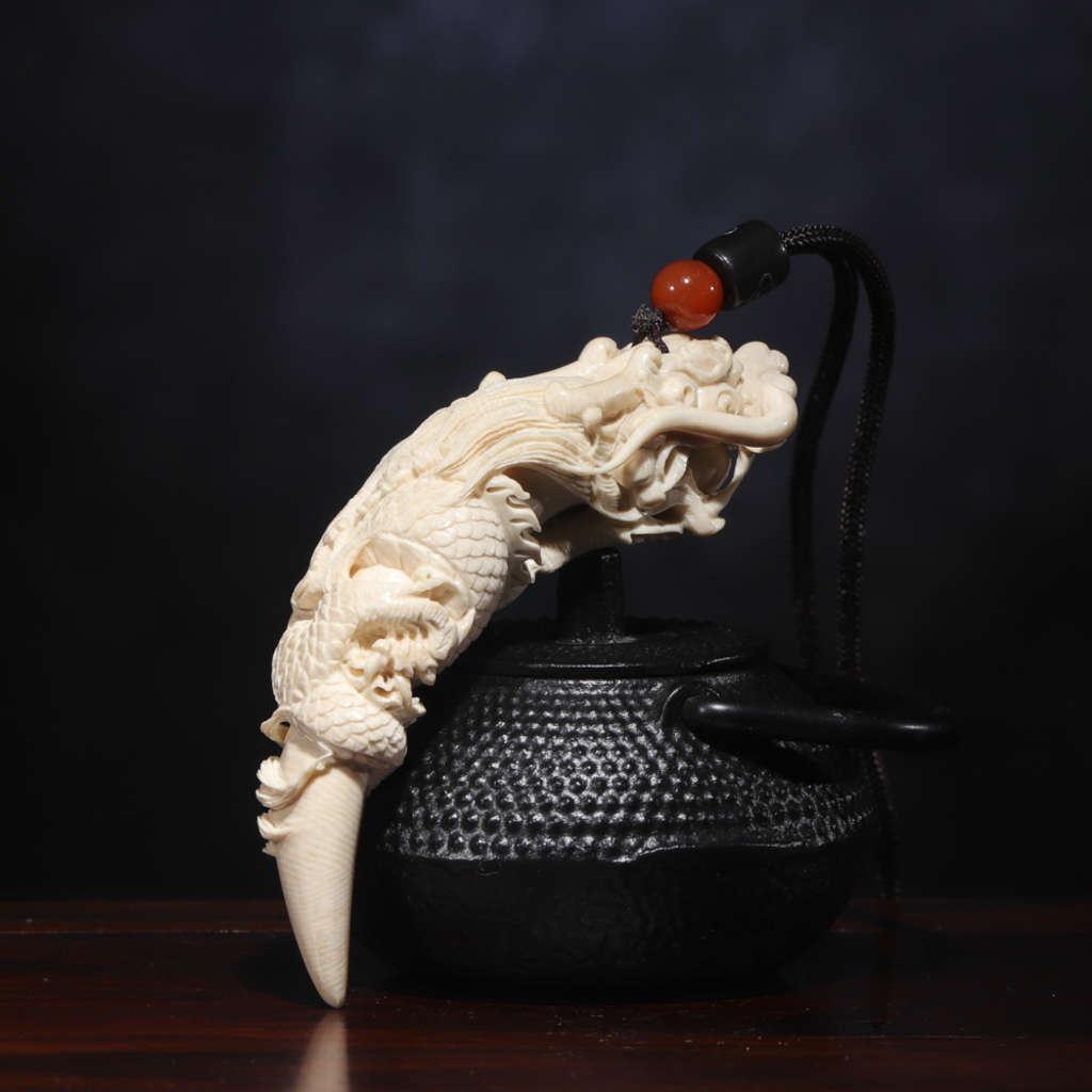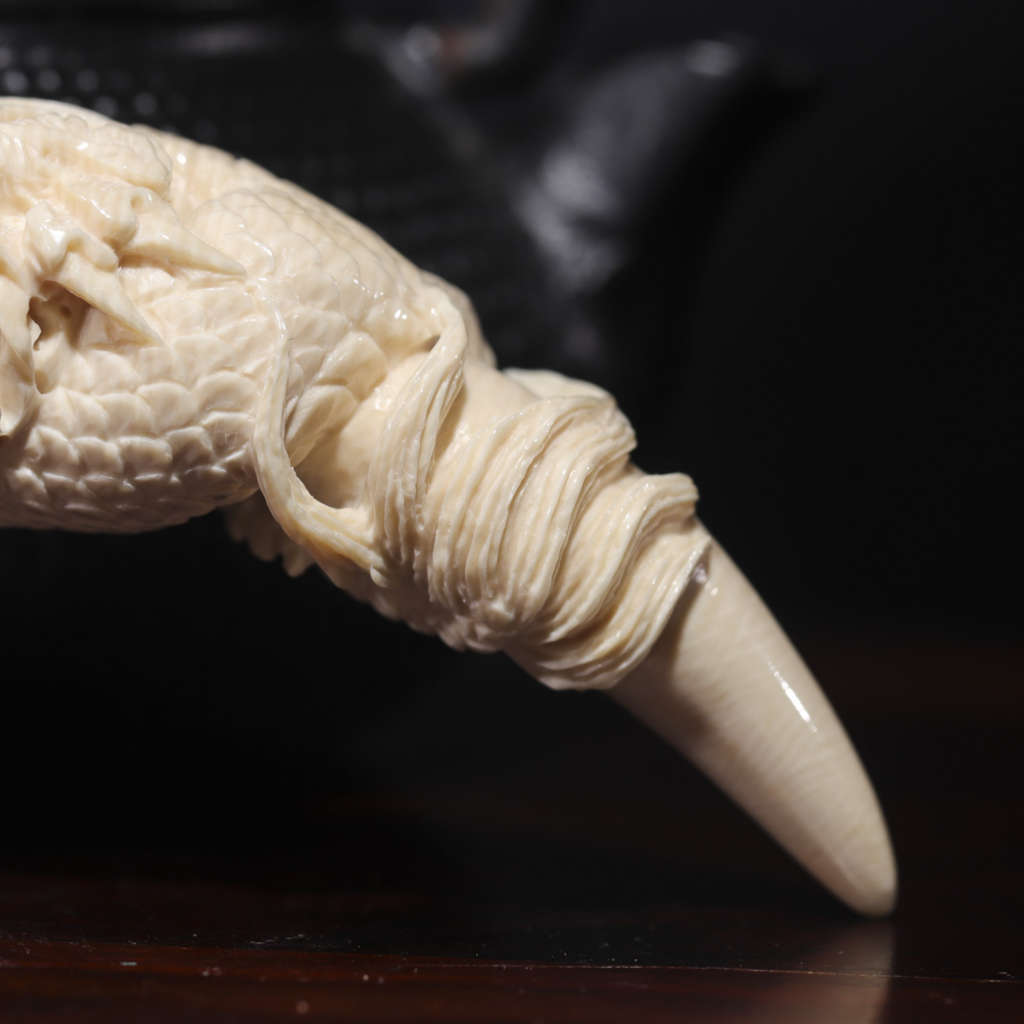 【猛犸牙雕作品】《鬼工龍牙尖》,二十年老師傅親手操刀!精選上乘猛犸冰料!紋路飽滿,質感潤澤!一只五爪祥龍口銜龍珠盤于牙尖之上,威武霸氣,十分靈動!口中龍珠可動,精細入毫,極具藝術觀賞價值!五爪龍是尊貴權威的象征!寓意能夠掌控財富,大業有所成,前途無限量!