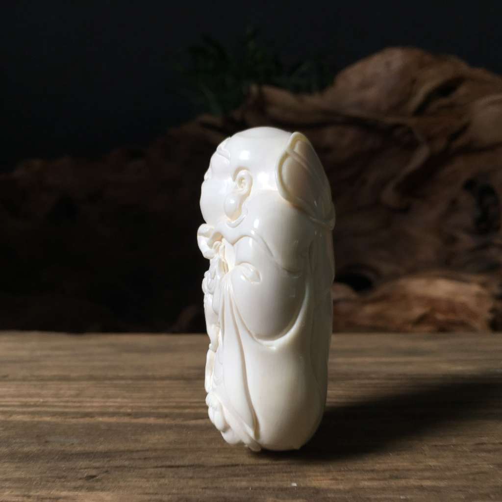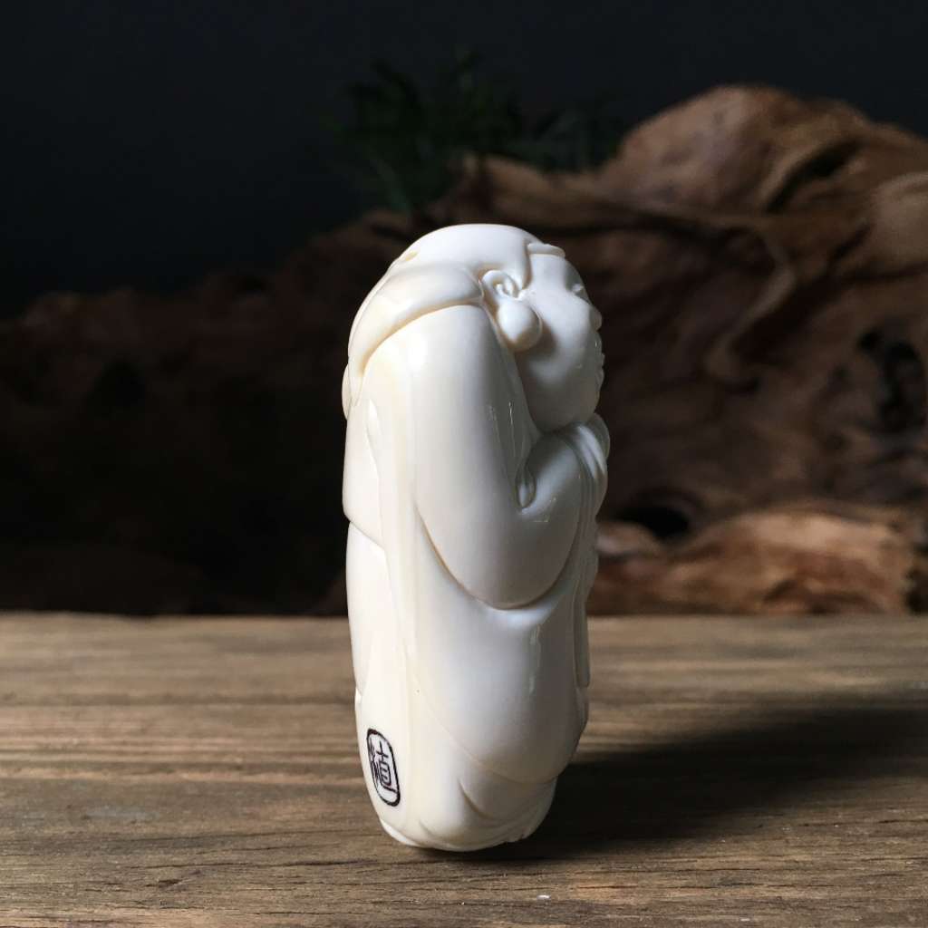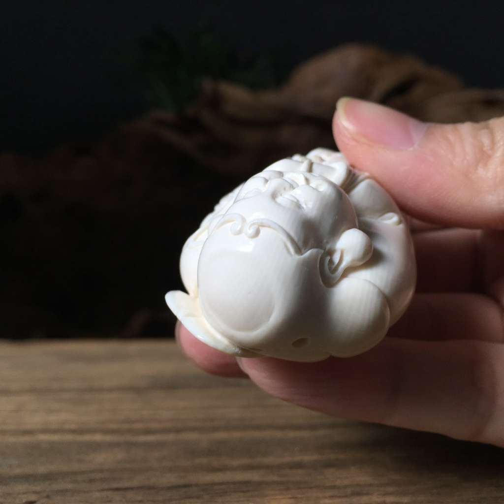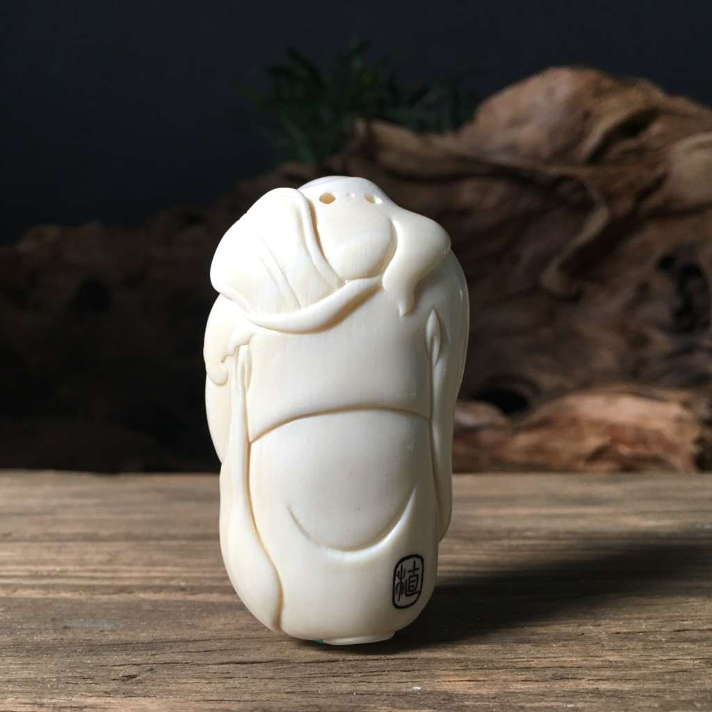 劉海戲蟾手把件,精選頂級白冰料,材質溫潤細膩,工藝精美,線條流暢。飄逸自然,開臉喜慶。把玩佩戴手感極佳。尺寸69x39x30mm:重:68.3g.材質:天然猛犸象牙原料。1700
