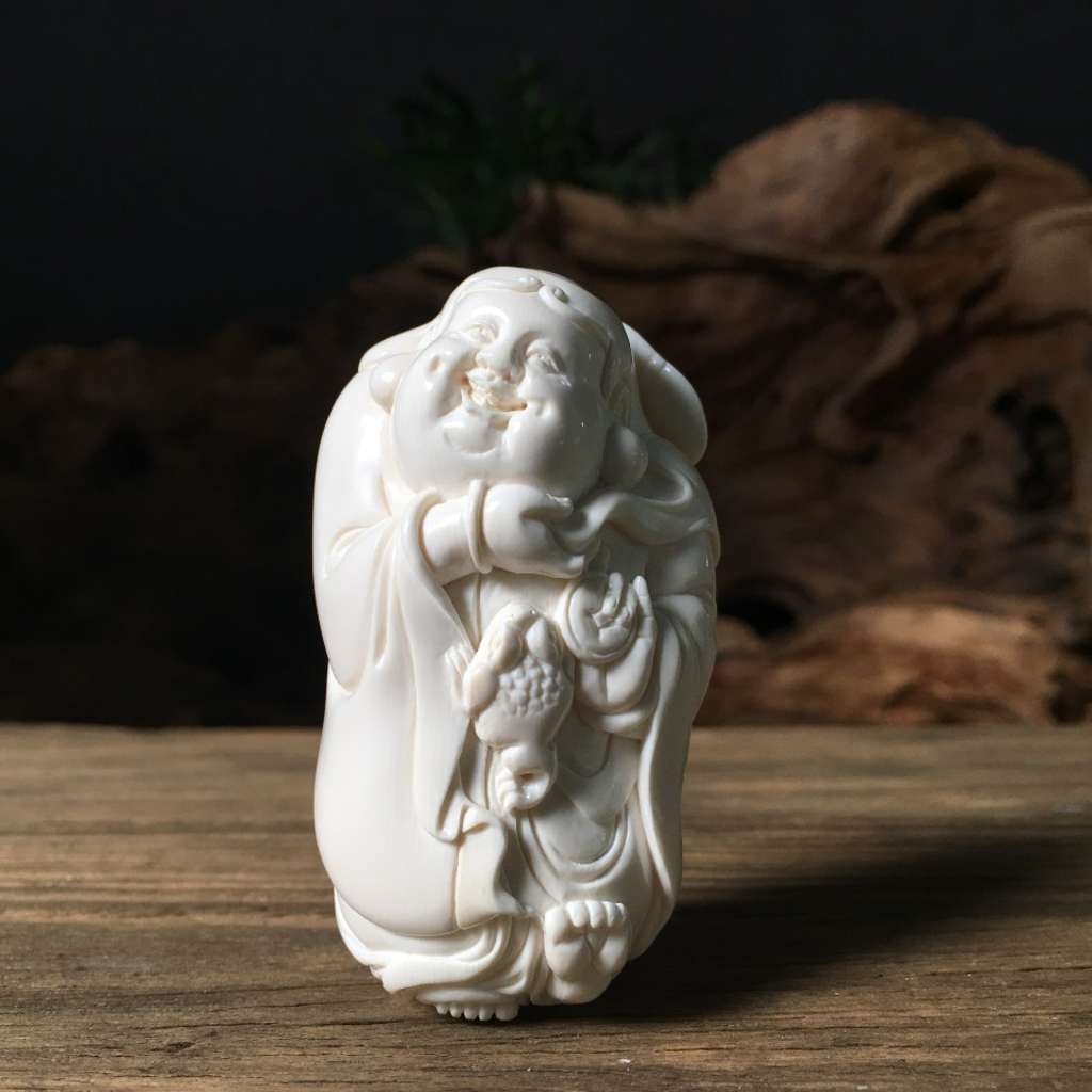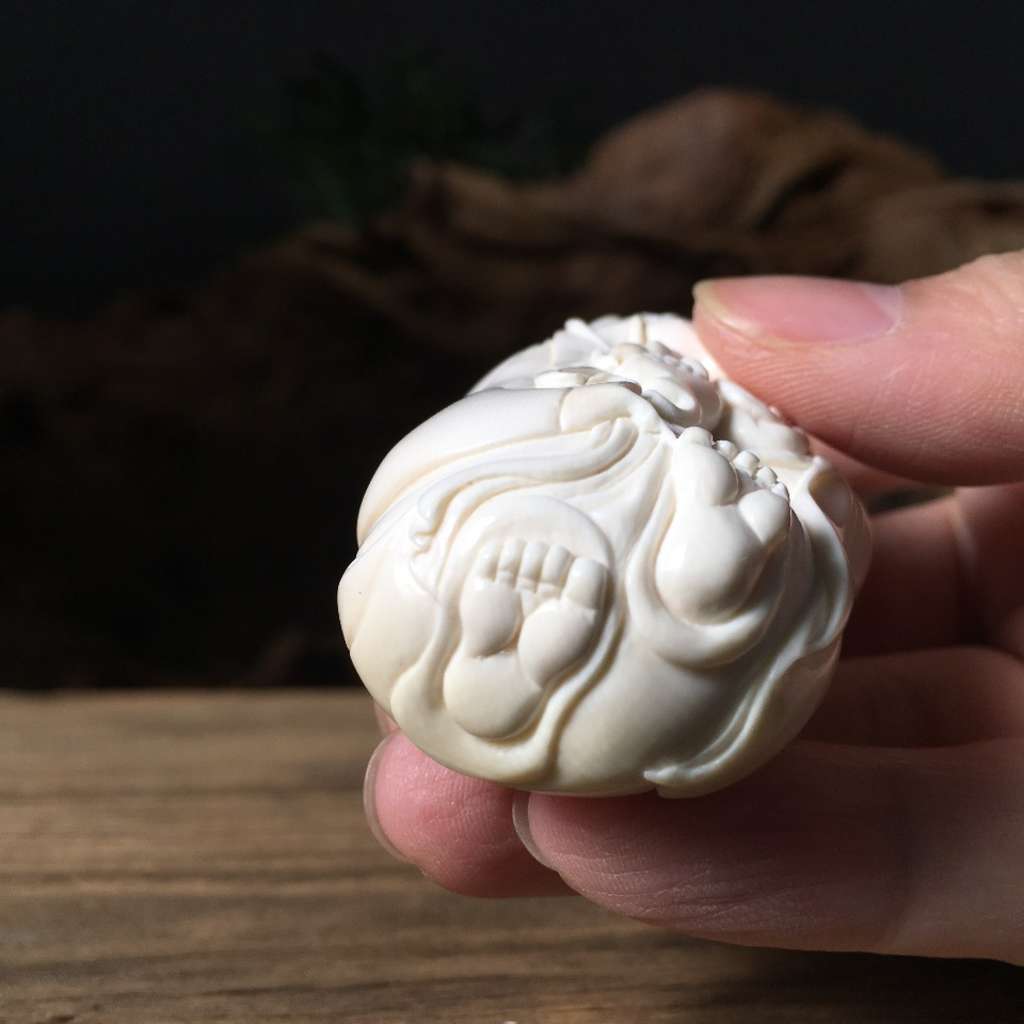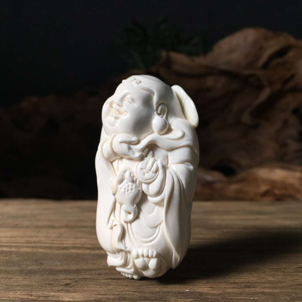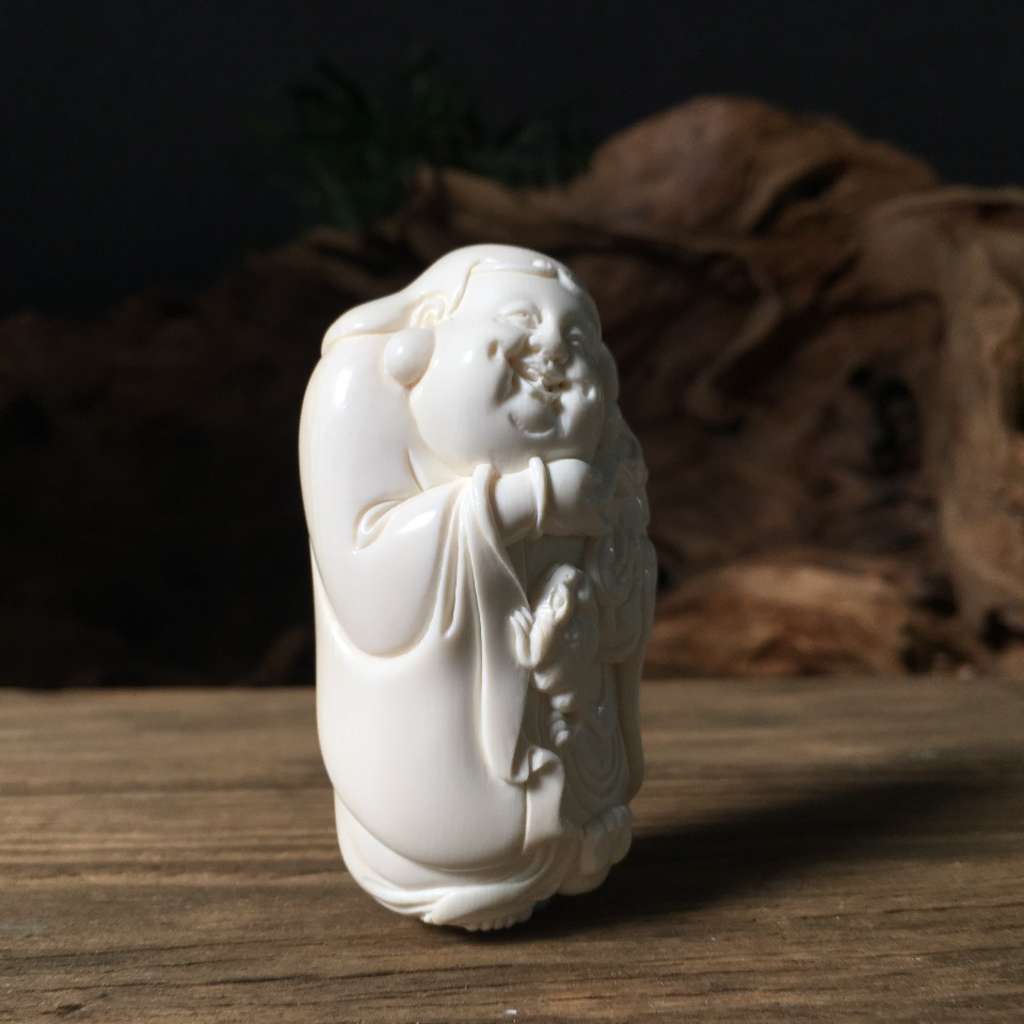 劉海戲蟾手把件,精選頂級白冰料,材質溫潤細膩,工藝精美,線條流暢。飄逸自然,開臉喜慶。把玩佩戴手感極佳。尺寸69x39x30mm:重:68.3g.材質:天然猛犸象牙原料。1700