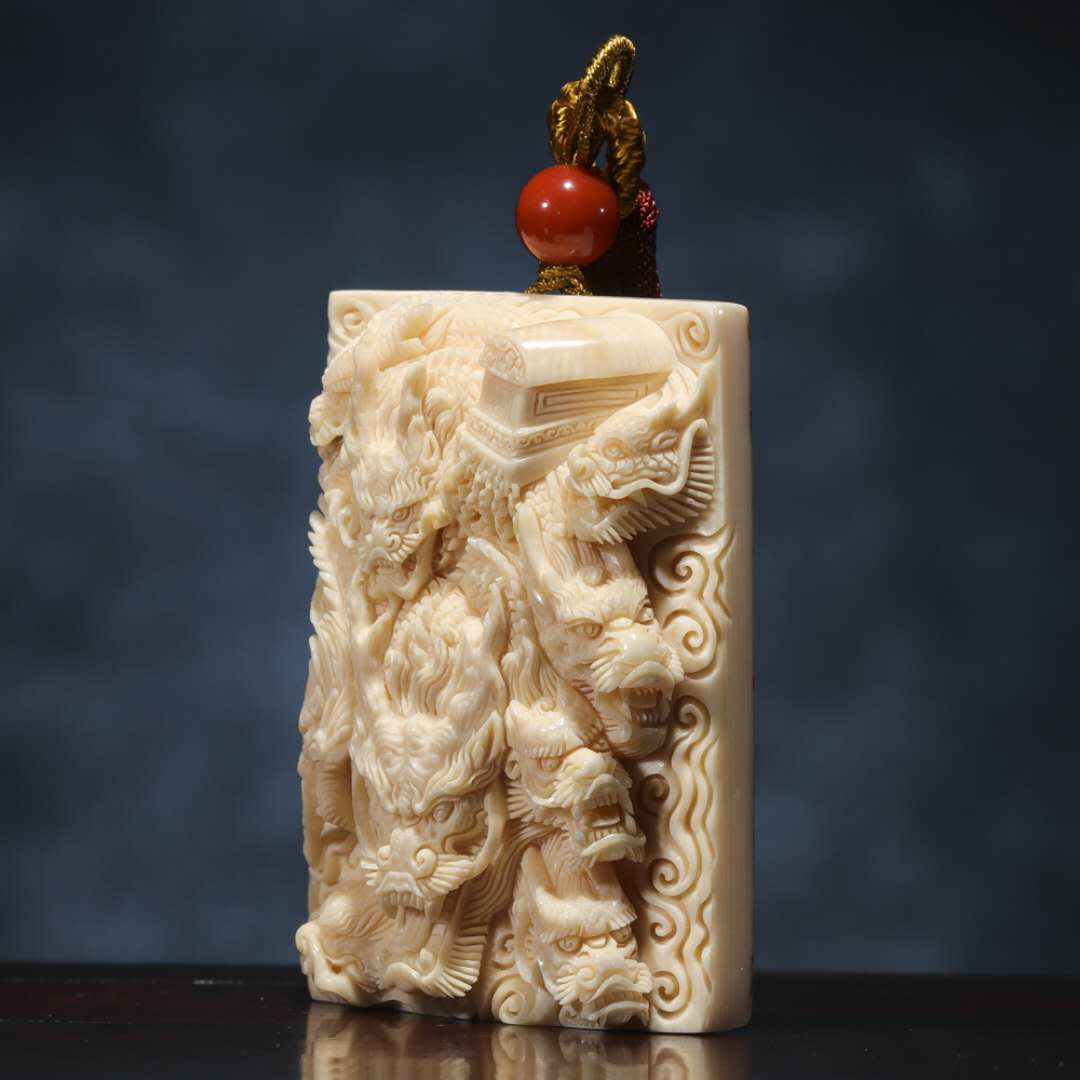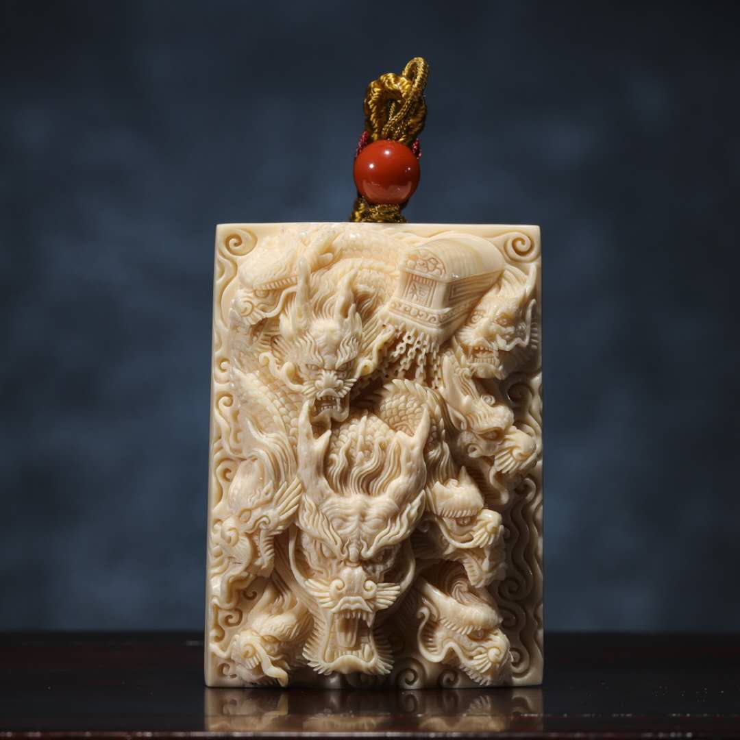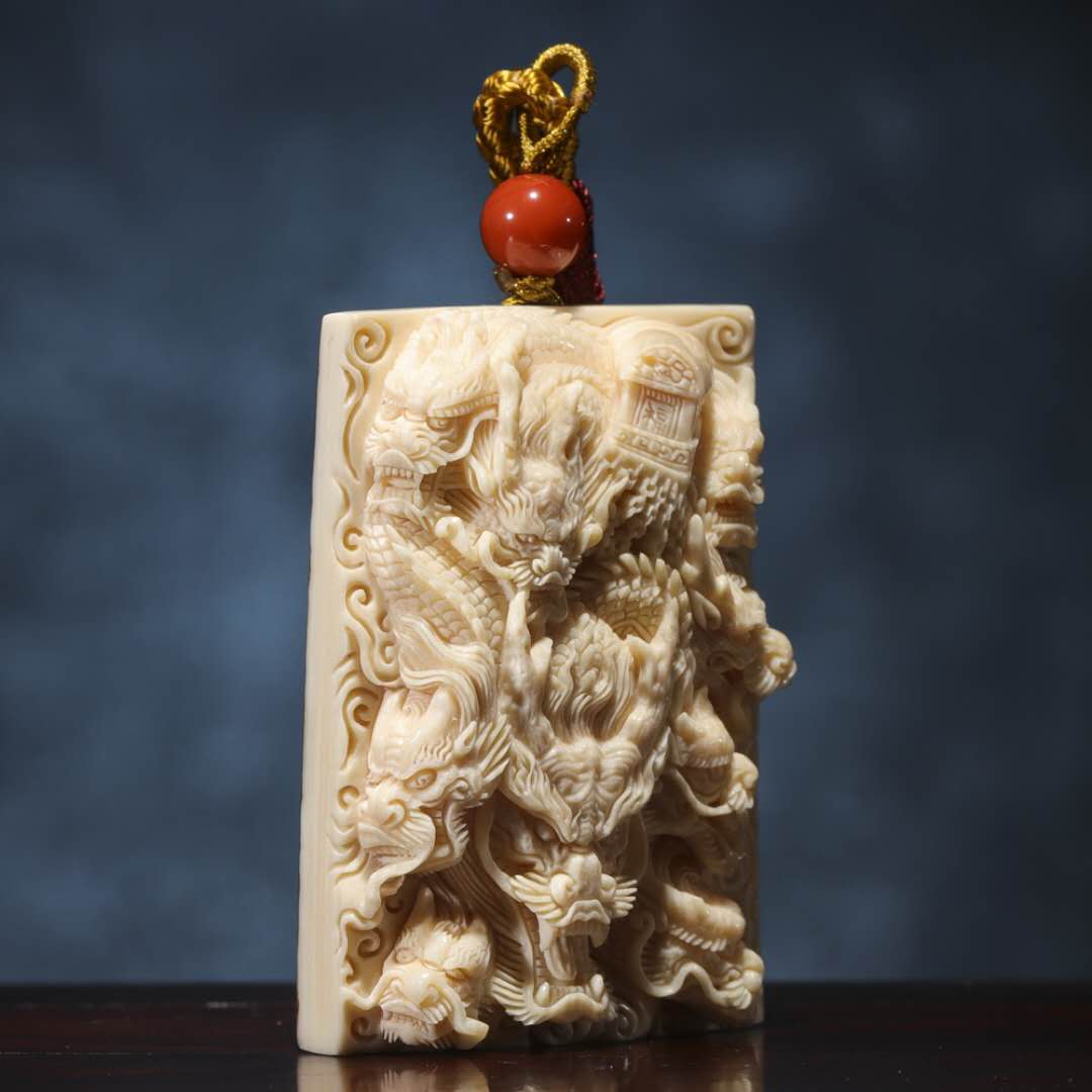 《九龍拉棺》九龍拉棺是尊貴權威的象征!寓意升官發財,大業有所成,前途無限量!由二十年老師傅親手操刀!精選上乘猛犸象牙帶皮冰料!紋路飽滿,質感潤澤!
