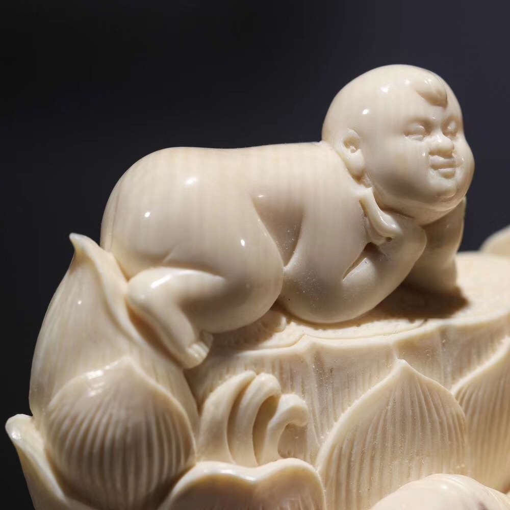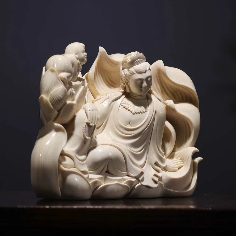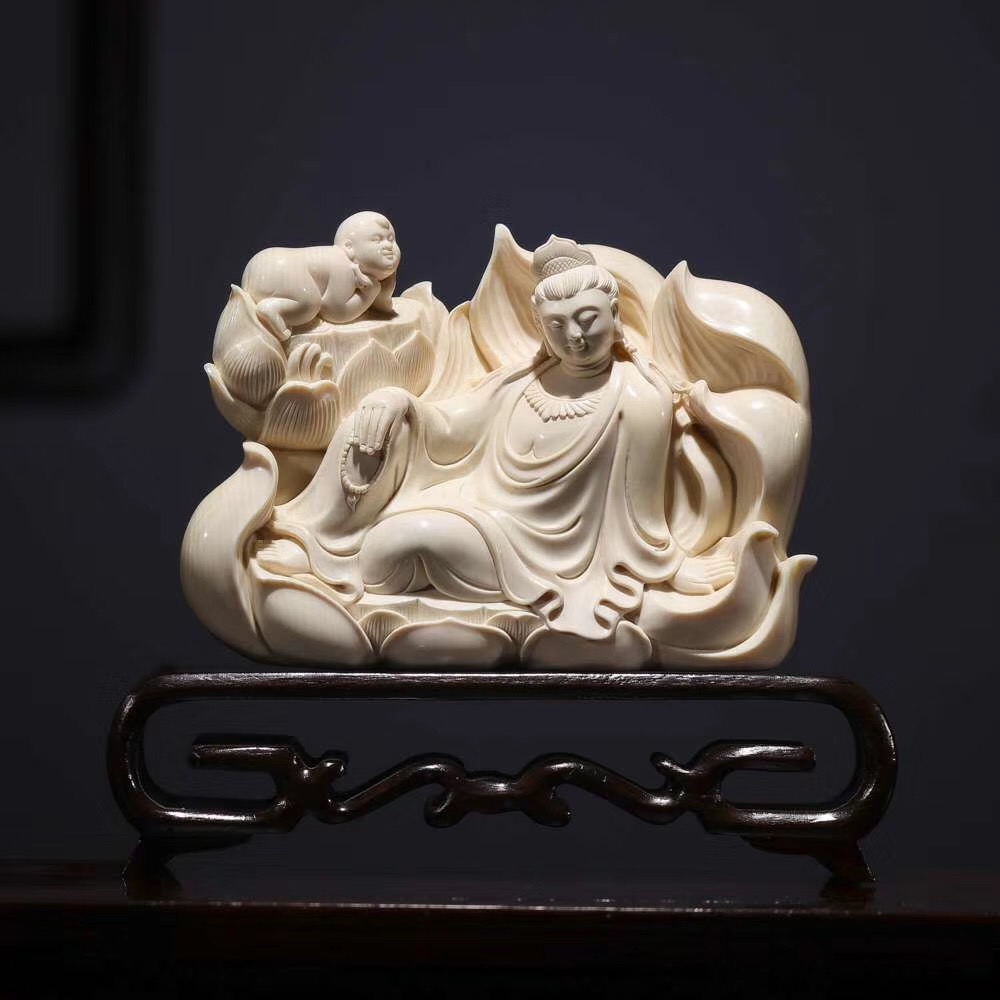 猛犸象牙《童子拜觀音》觀音菩薩其容貌飽滿圓潤,姿態端莊秀美,品性慈悲善良