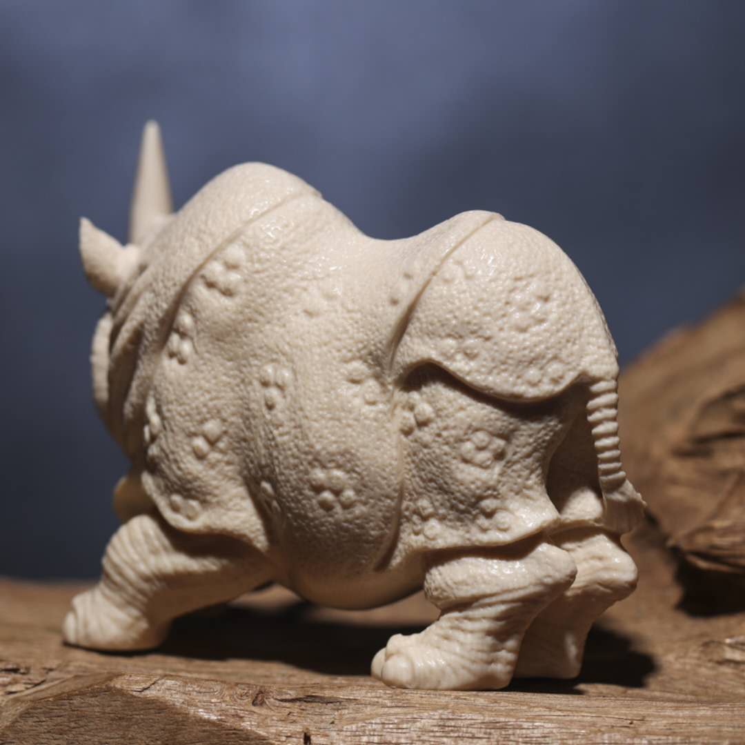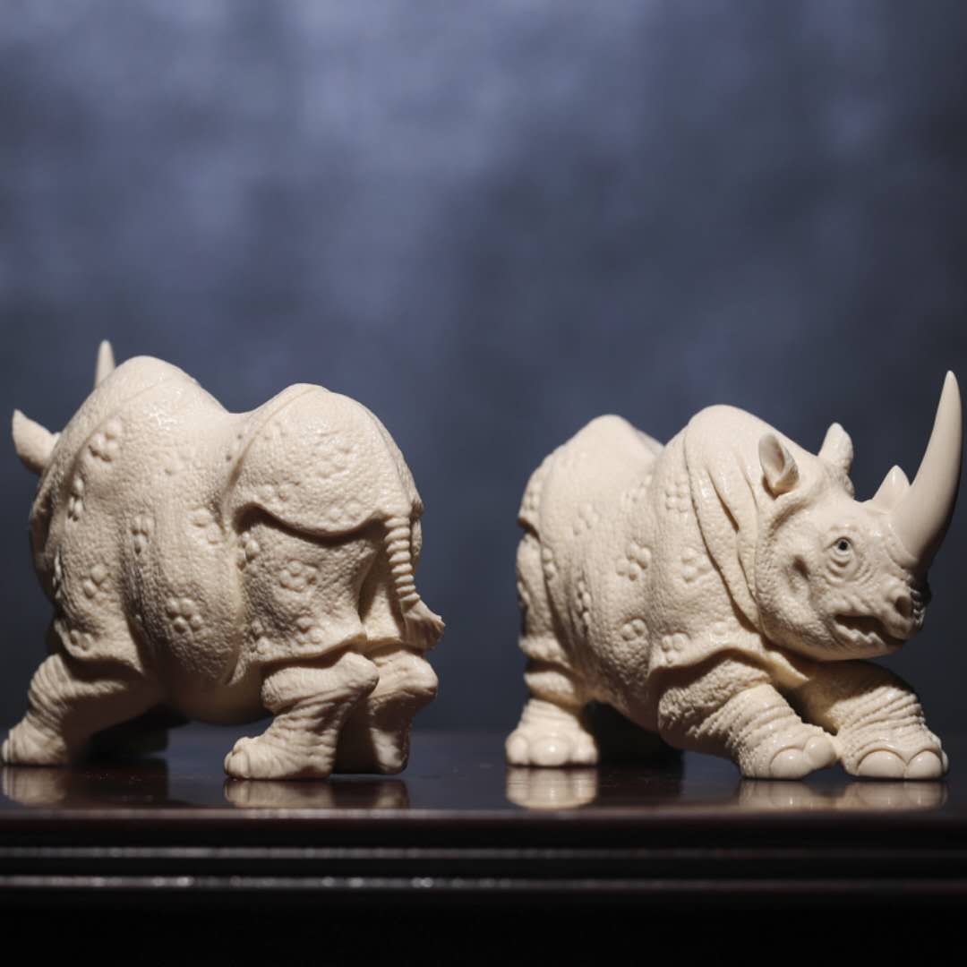 犀牛對擺,牙質冰透水潤,純手工滿工精雕,去料多。細膩精湛,紋理清晰,大師手工,線條流暢,栩栩如生。可擺放于家中、辦公室。寓意鎮宅辟邪,事業紅火。尺寸:71x50x28mm,66x45x26mm,對重:127.7g.4200