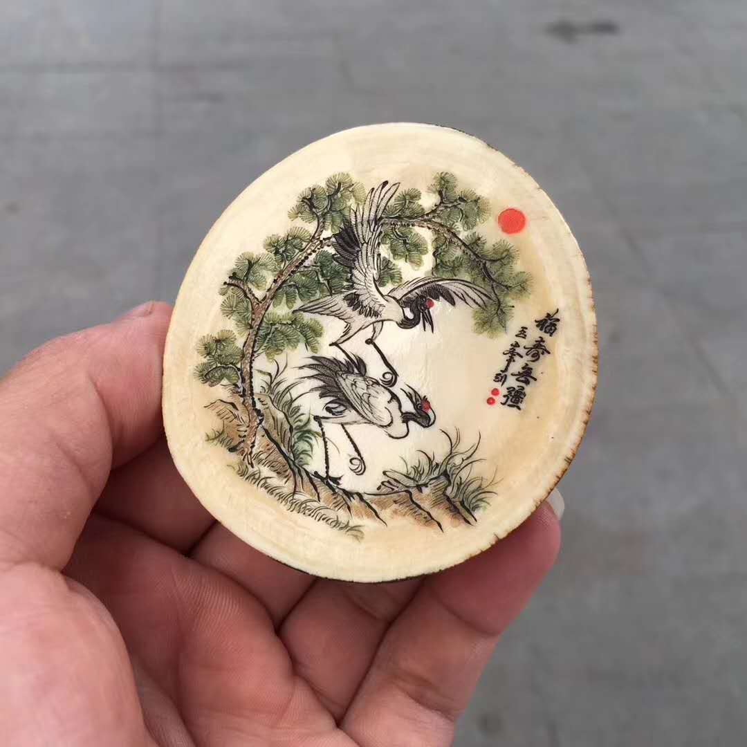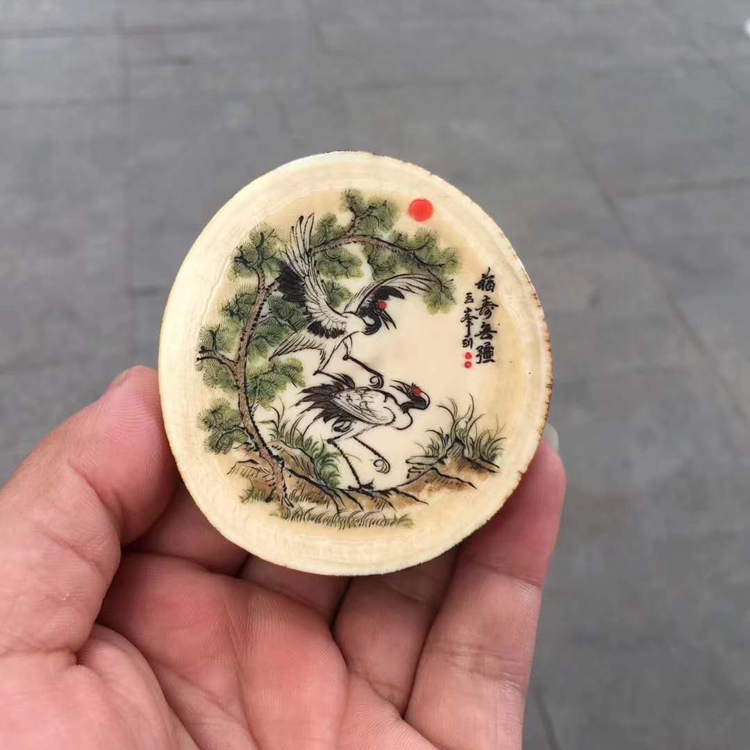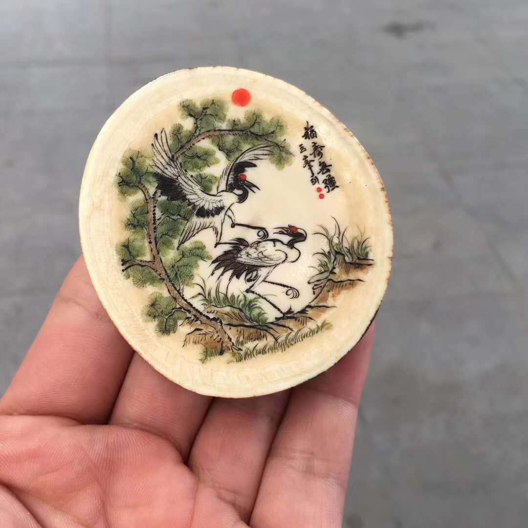 猛犸象牙雕極品原牙切餅,雙面微雕松鶴延年,皮色精美光潤(rùn),肉色冰潤(rùn)滿紋小口徑適宜把玩佩戴。60×65×13mm,69.2g,價(jià)1180元