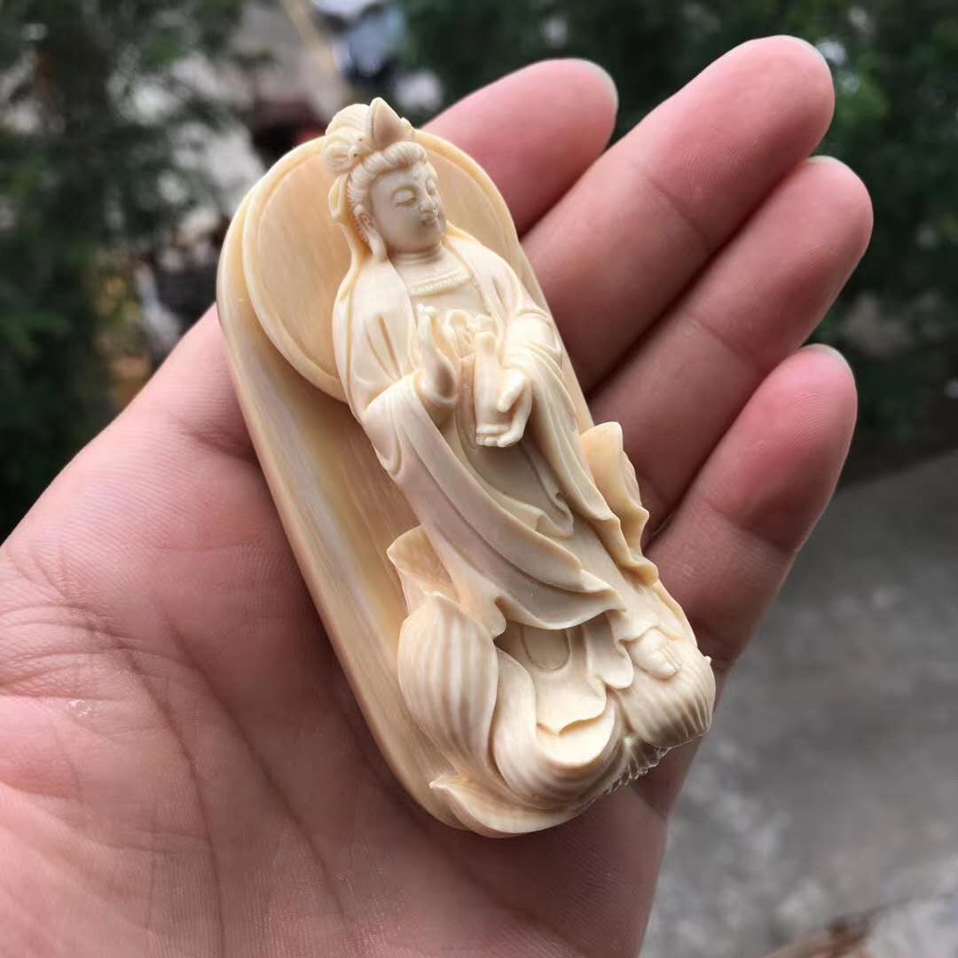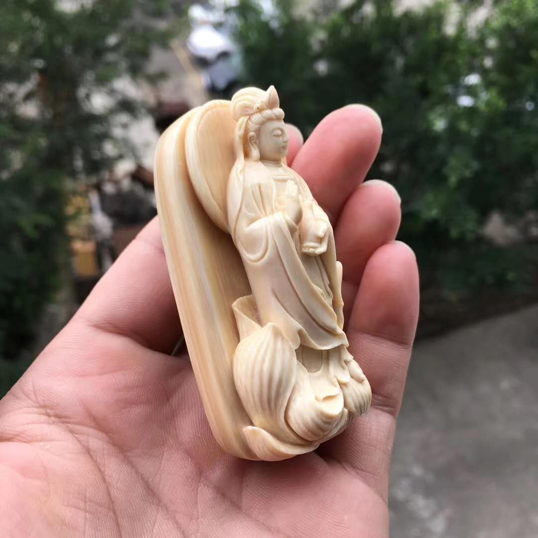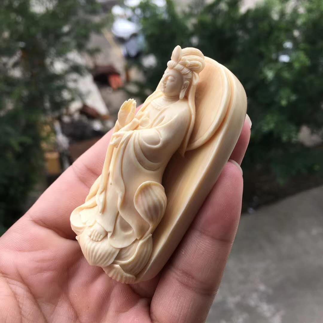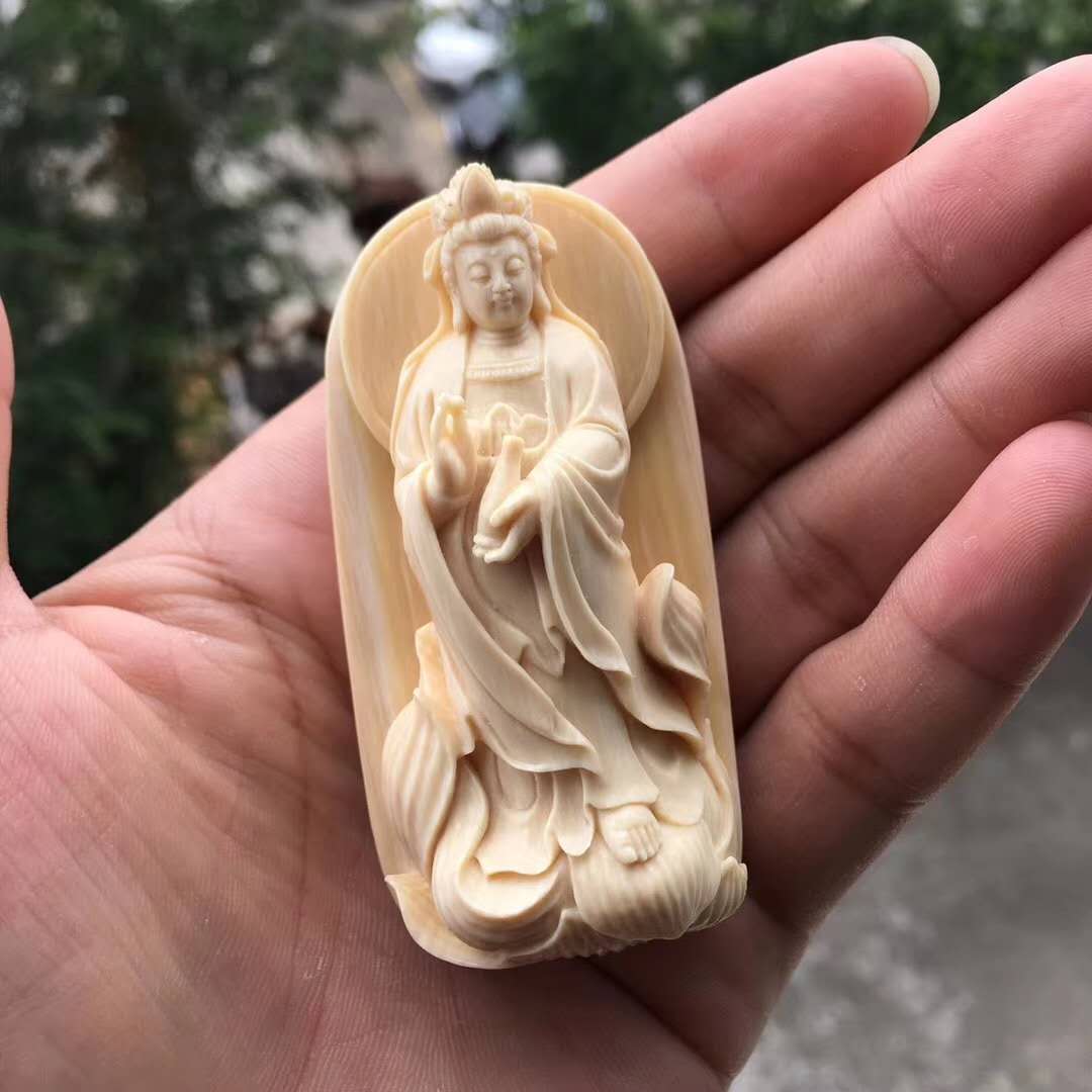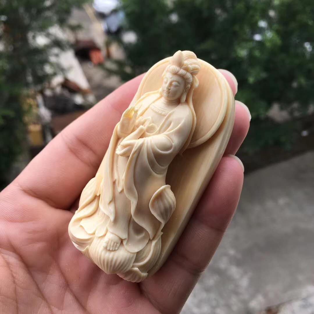 猛犸牙雕金植大師匠心佳作【凈瓶觀音】精選頂級猛犸白冰料,背后深棕皮色,牙質細膩潤澤,紋路清晰漂亮,超立體雕刻,雕刻細致入微,線條飄逸流暢,法相莊嚴神圣,放大之后就是一尊廟堂供奉級擺件,非克價凡品,規格73*37*26mm,72.5g
