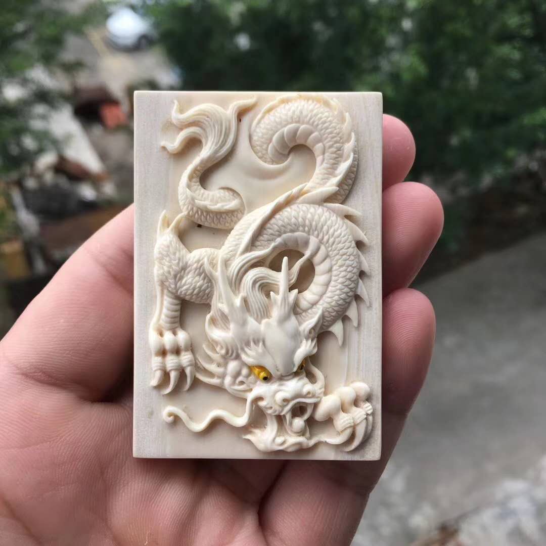 猛犸象牙雕【祥龍獻瑞】勇創作品,純手工立體精雕,工藝精湛,難得佳品,雕刻簡介大氣,原色極品藍皮,大師落款,尺寸67*45*15mm, 重47.5g。克價黨繞行!精品緣作