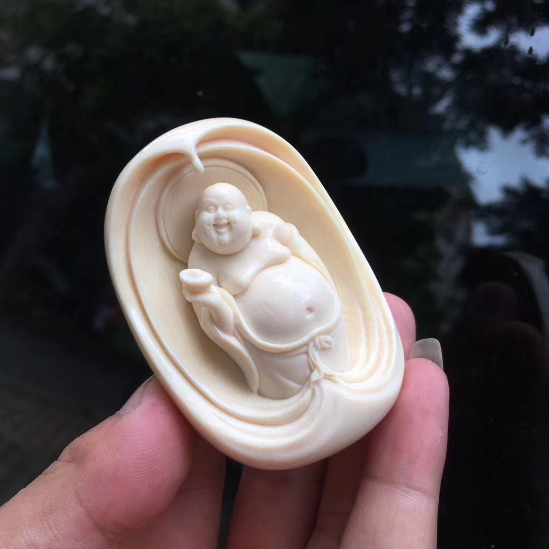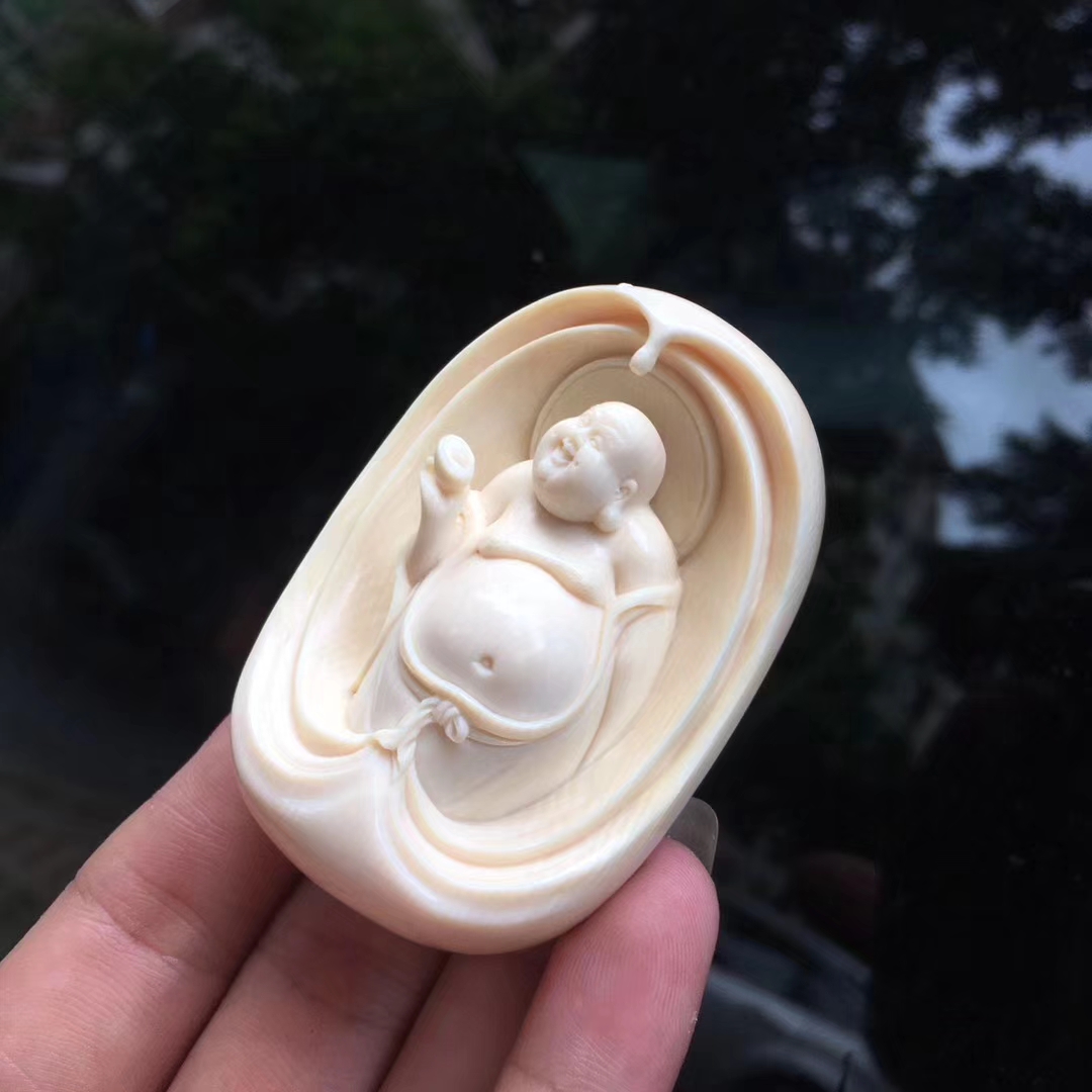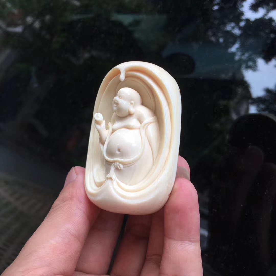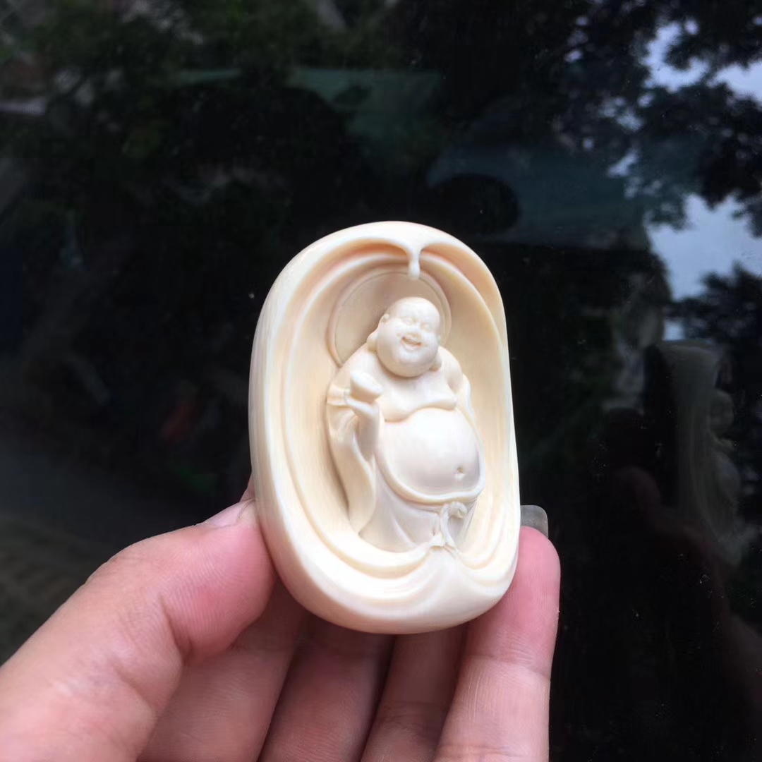 猛犸牙雕作品元寶彌勒佛掛牌,大師意境之作。大肚彌勒面容祥和,