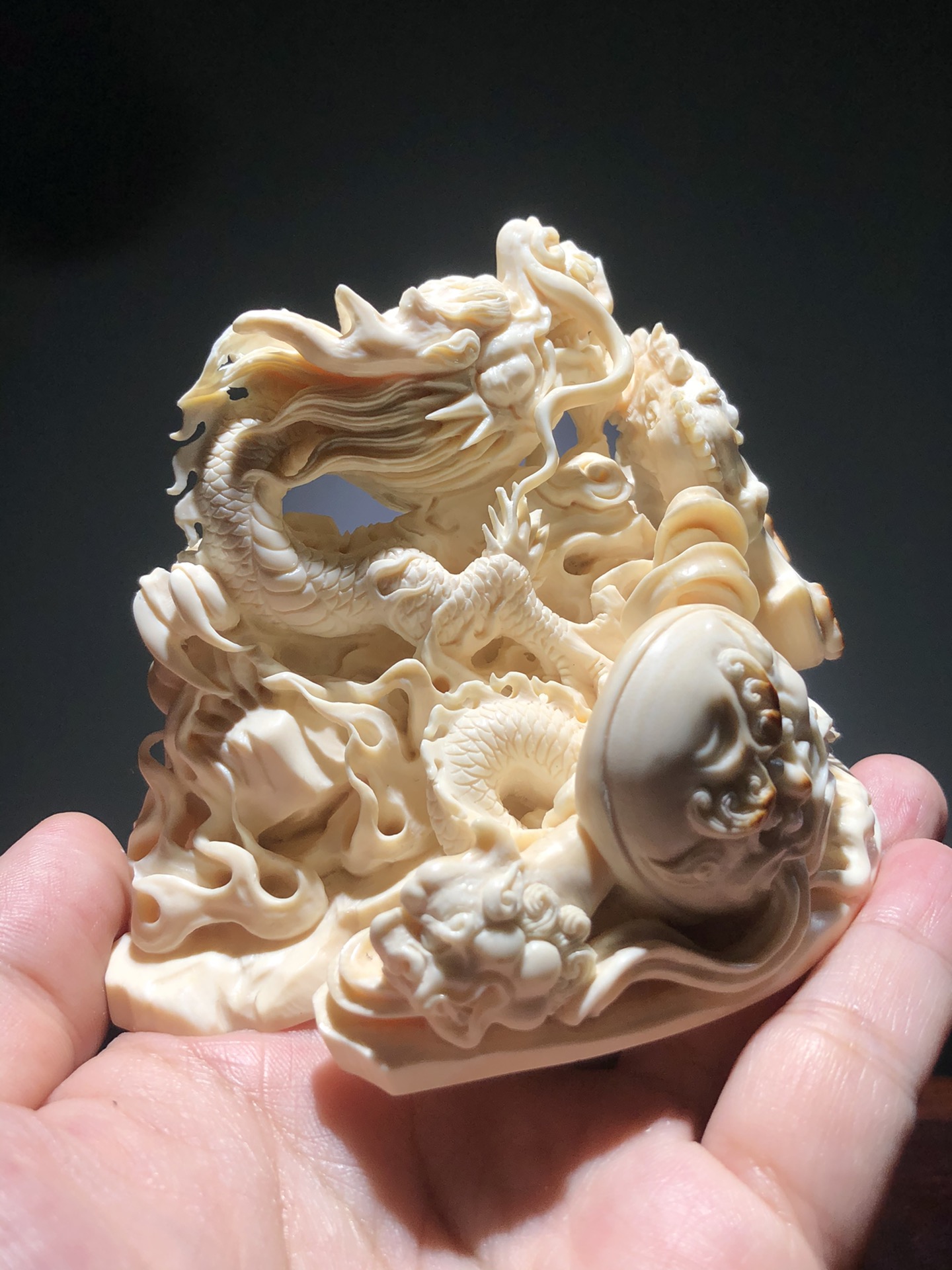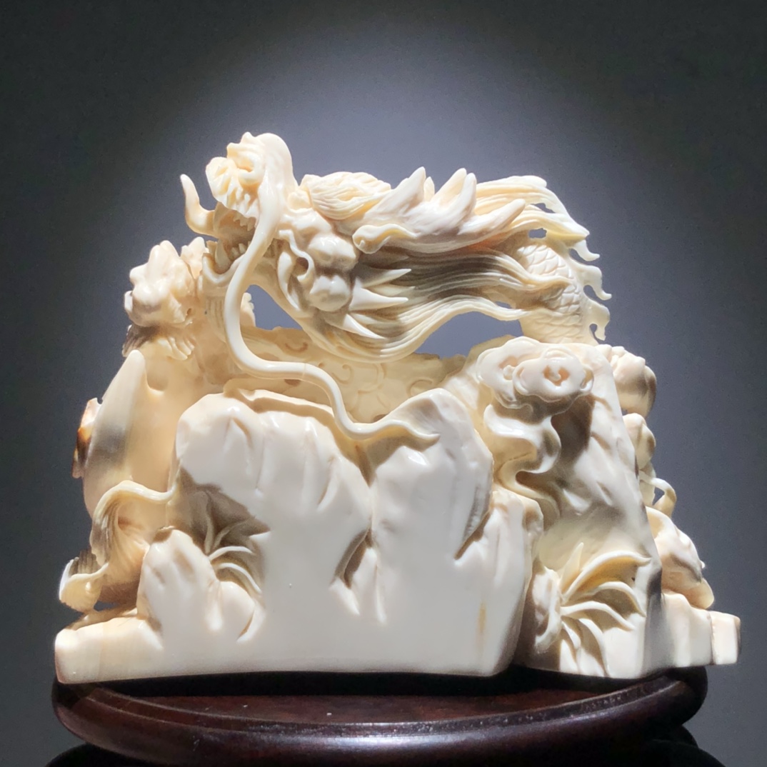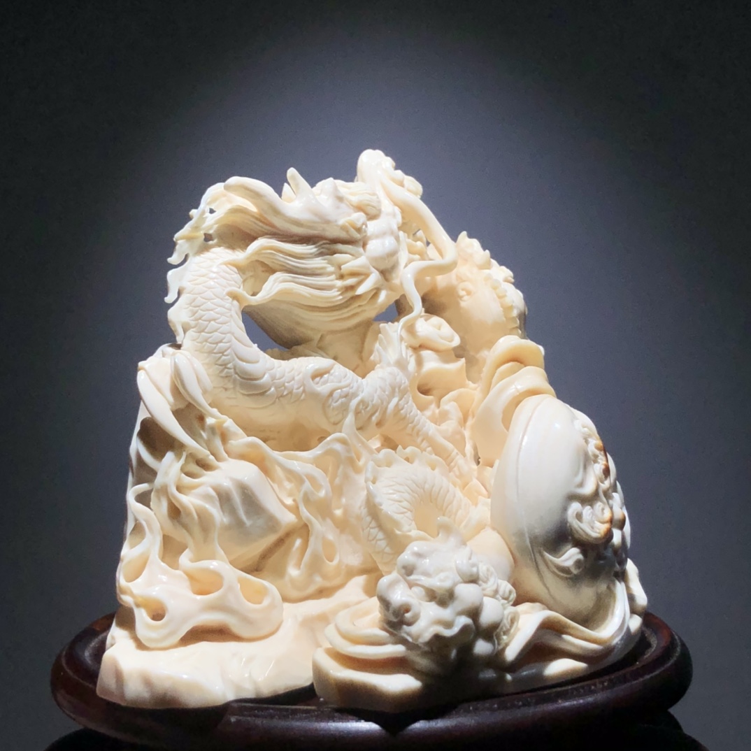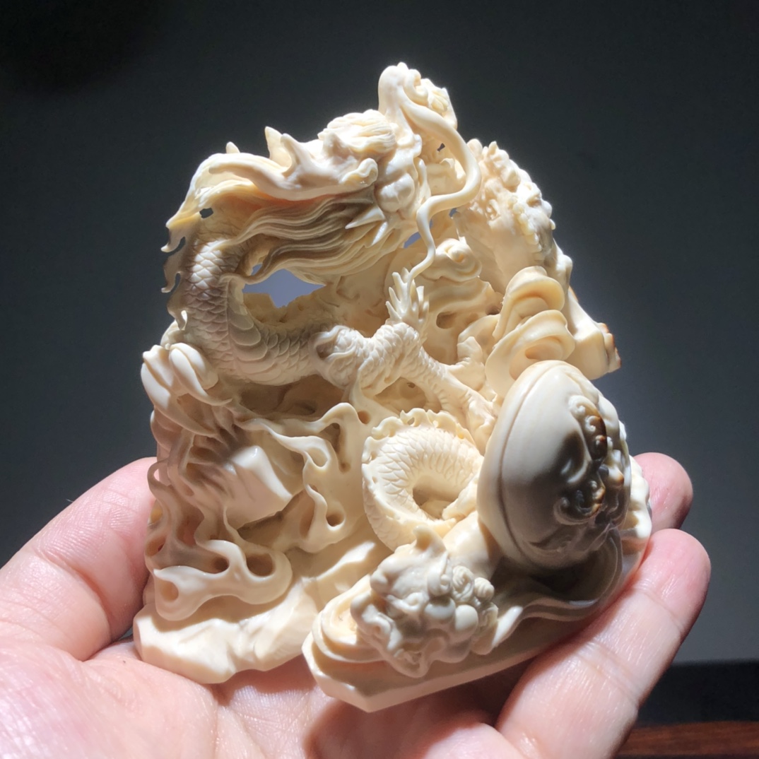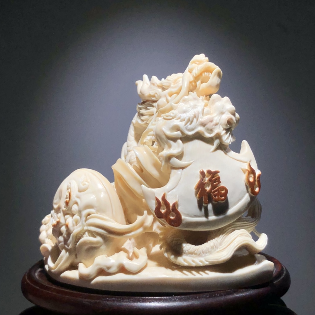 《府上有龍》賞擺、精選優質猛犸白冰料、牙質油潤,紋路清晰,大師作品滿雕工藝、斧上可以皮雕福字、神龍栩栩如生!寓意府上有龍 ,必出貴子。 克重約:229.5g 規格約:98×74×64mm